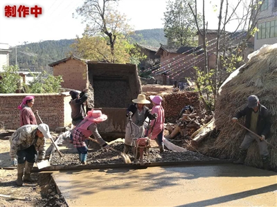 拖拉机伴随着打磨机等机械的轰鸣声,在早上8点的阳光中回荡在花园村的上空,几十个村民清障、垫土、定边、浇灌、打磨每个工序都有条不紊地运行着,当记者来到武定县高桥镇唐家村委会花园村民小组的时候,看到的正是这样一幅热火朝天的“筑路图”。